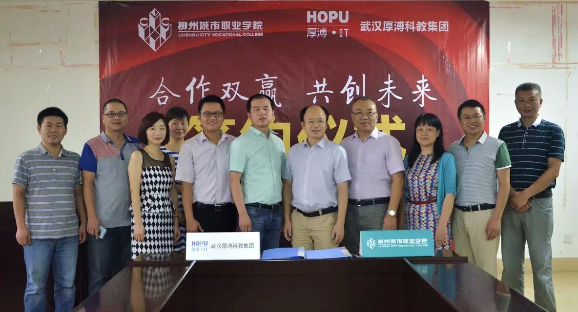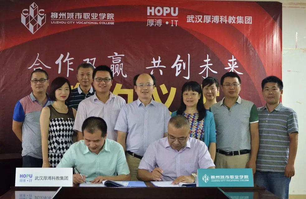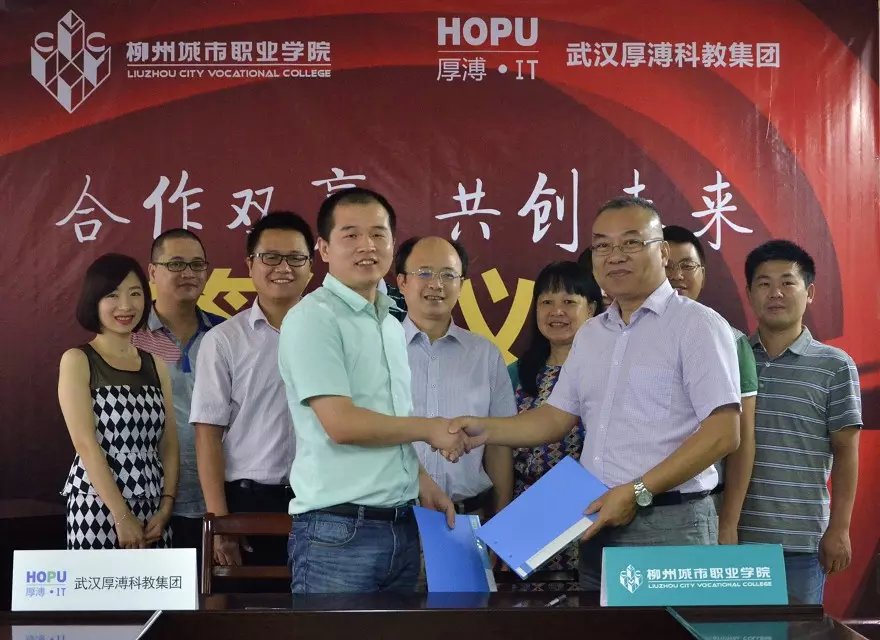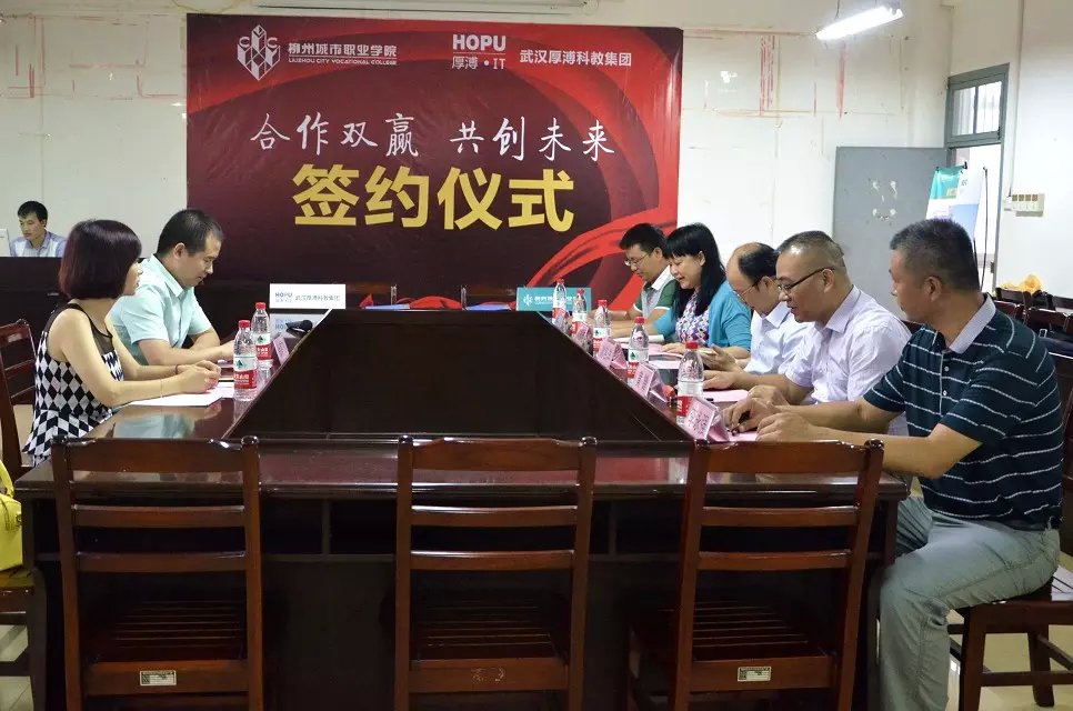 7月23日上午,武漢厚溥教育科技有限公司在柳州城市職業(yè)學院,與校方簽訂校企合作協(xié)議聯(lián)合辦學,建立“厚溥軟件學院”。武漢厚溥教育科技有限公司常務副總兼技術總監(jiān)翁高飛、戰(zhàn)略發(fā)展部市場總監(jiān)李薇薇出席簽約儀式,柳州城市職業(yè)學院院長謝名洋、副院長黃鋒、黨政辦主任黃?、教務處處長陳柳艷、信息工程系主任唐子蛟、系黨總支書記李永強共同參加簽約儀式。