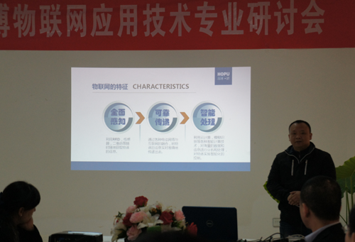 參加本次研討會的學校嘉賓有:荊州職業(yè)技術(shù)學院副院長方風波、教務處處長詹永東、校企合作與就業(yè)處處長湯欽林、國際信息技術(shù)學院常務副院長蔡波以及信息技術(shù)系專業(yè)教師;湖北國土資源職業(yè)學院副院長周從軍、信息技術(shù)系主任管勝波、信息技術(shù)系書記馮越;黃岡職業(yè)技術(shù)學院電子信息工程學院院長羅幼平、物聯(lián)網(wǎng)教研室主任李敏;湖北三峽職業(yè)技術(shù)學院電子信息工程學院院長李建利、電子信息工程學院副院長秦工、電子信息工程學院專業(yè)教師鄒志龍;武漢厚溥教育科技有限公司副總經(jīng)理黎祝明、技術(shù)總監(jiān)翁高飛、物聯(lián)網(wǎng)專業(yè)負責人李杰、專業(yè)研究員涂建以及各合作學校的學術(shù)經(jīng)理、物聯(lián)網(wǎng)專業(yè)老師等。