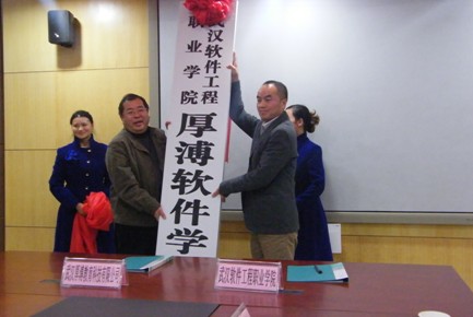 會(huì)議第三項(xiàng)雙方簽署協(xié)議,由武漢厚溥教育科技有限公司總經(jīng)理胡俊和武漢軟件工程職業(yè)學(xué)院副校長王路群共同簽署相關(guān)文件。同時(shí)在熱烈的掌聲中廖世平書記和陳相陽董事長為新成立的厚溥軟件學(xué)院揭牌。